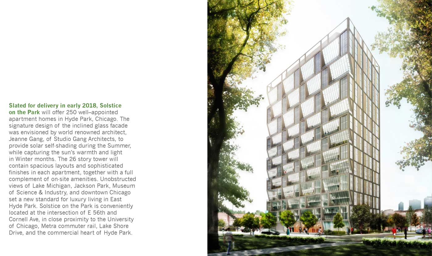 Solstice on the Park is a 250-unit luxury apartment building, with ancillary parking structure and on-site resident amenities. Located in Hyde Park, Chicago, this state of the art residential tower is scheduled for occupancy in early 2018.